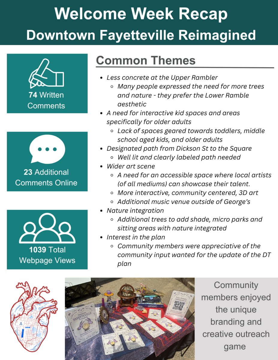 We met with community members to gain feedback and input about their hopes and dreams for the future of Downtown Fayetteville. The following questions were asked through an interactive tarot card game: